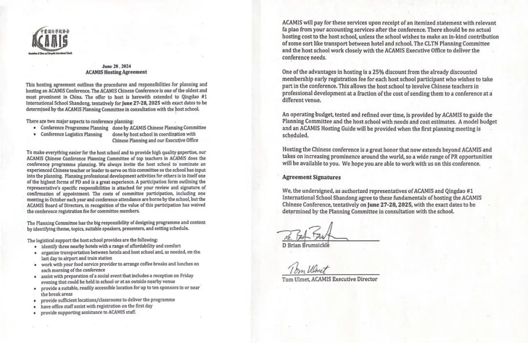 青岛城投集团旗下青岛第一国际学校于6月27日通过了ACAMIS国际学校协会的实地考察,正式获得2025年ACAMIS中文大会承办权。大会将于2025年6月19-21日举行,届时,ACAMIS国际学校协会及大中华地区、亚洲周边国家国际学校的260名中文(中国文化)教师将齐聚青岛,进行为期两天的8项主题讲座及教研展示活动。