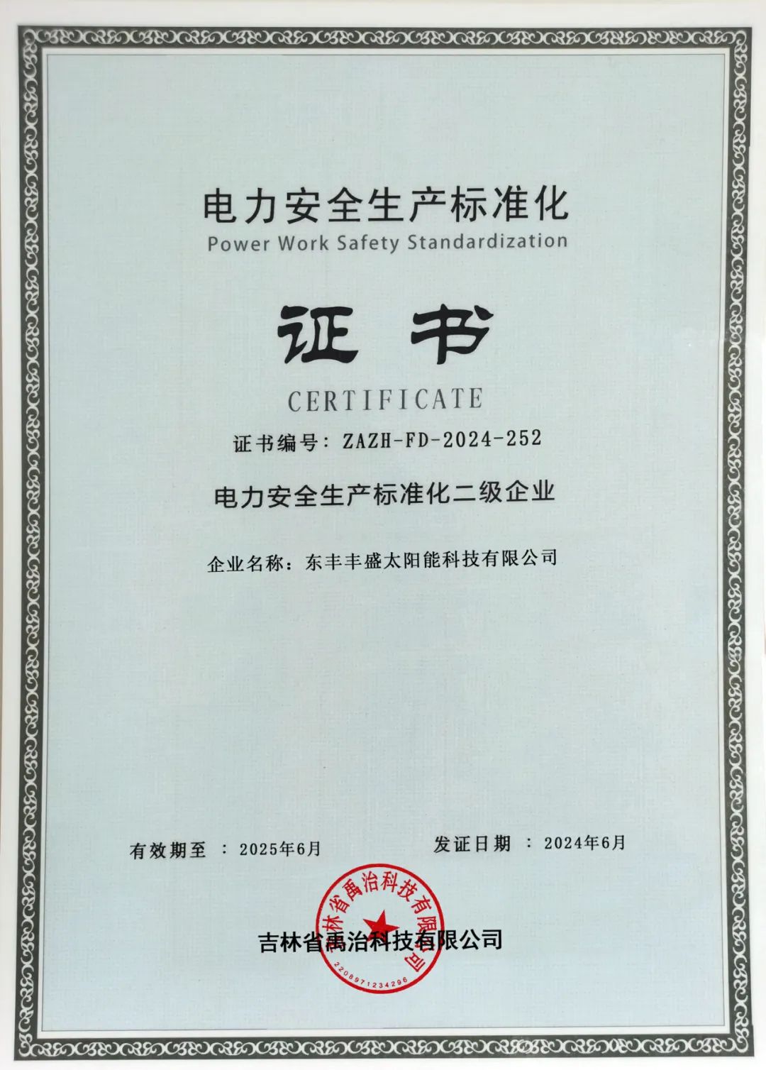 (图为下属项目公司电力安全生产标准化二级证书)