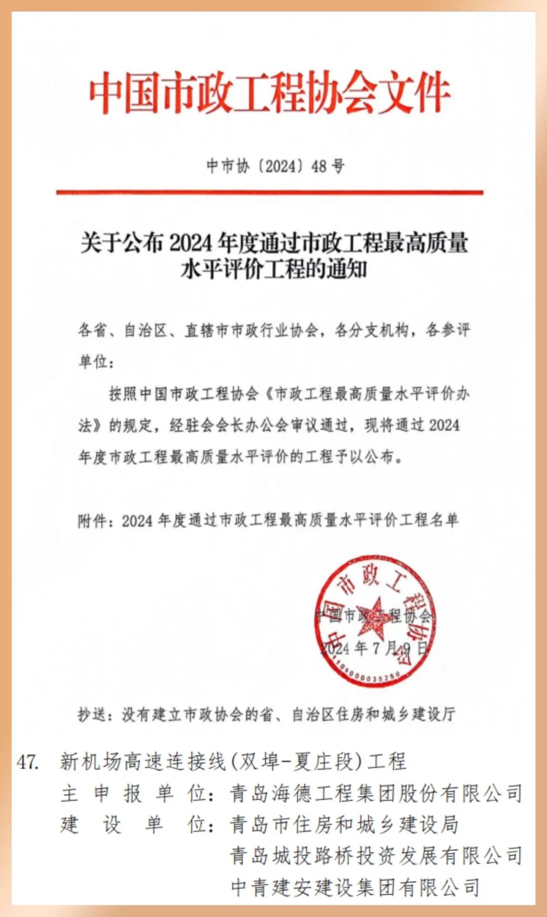 近日,由青岛城投集团旗下城市更新集团代建的新机场高速连接线(双埠-夏庄段)工程荣获2024年度中国市政工程最高质量水平评价。该项目凭借质量、安全、技术创新等方面的卓越表现,获得了中国市政协会的最高荣誉。