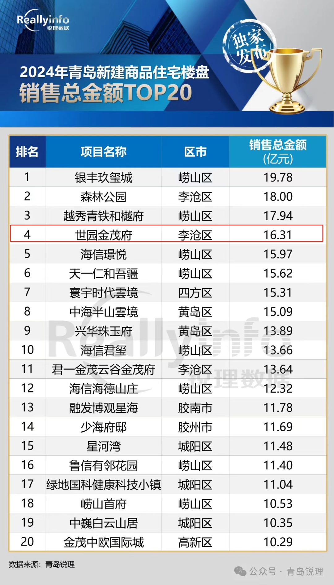 近日,2024年青岛市商品房销售榜单正式发布,青岛城投集团世园·金茂府项目以16.31亿元销售总金额荣登2024年青岛新建商品住宅楼盘销售金额榜第4名,超额完成全年销售目标任务。