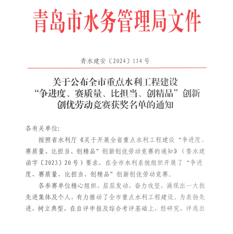 被青岛市水务局评为2024年度青岛市“争进度、赛质量、比担当、创精品”创新创优劳动竞赛文明工地、优胜集体。