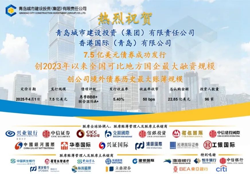 4月1日,青岛城投集团通过境外子公司香港国际(青岛)有限公司成功定价3年期7.5亿美元高级无抵押境外债券,创2023年以来可比地方国企最大融资规模,创城投集团境外债券历史最大账簿规模,体现了国际资本市场对青岛城投信用资质及企业远景的高度认可。