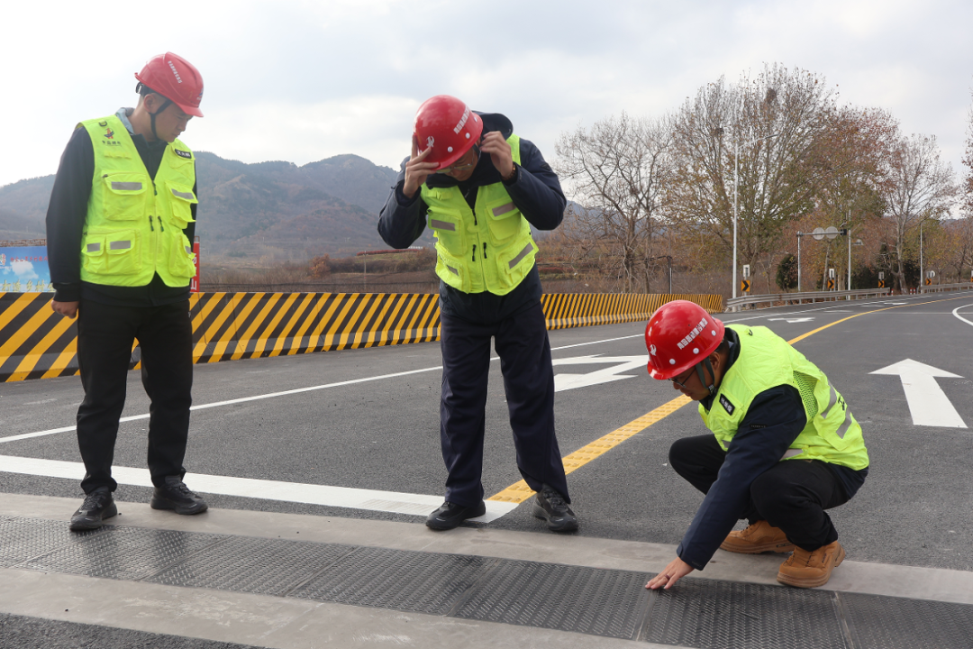 此外,交发集团在G341黄海线西海岸新区段大中修工程建设中创新引入无缝伸缩缝技术和红色减速带材料,是青岛市国省干线大中修项目的首次应用。无缝伸缩缝用高强度橡胶材质取代金属材质,有效解决了传统伸缩缝噪音大、易积水、行车颠簸等痛点,显著提升道路通行舒适度与耐久性。在杨家山里村段连续2公里长下坡路段,应用红色减速带以醒目色彩持续提醒驾驶员控速避险,为该危险路段行车安全筑牢预警防线。