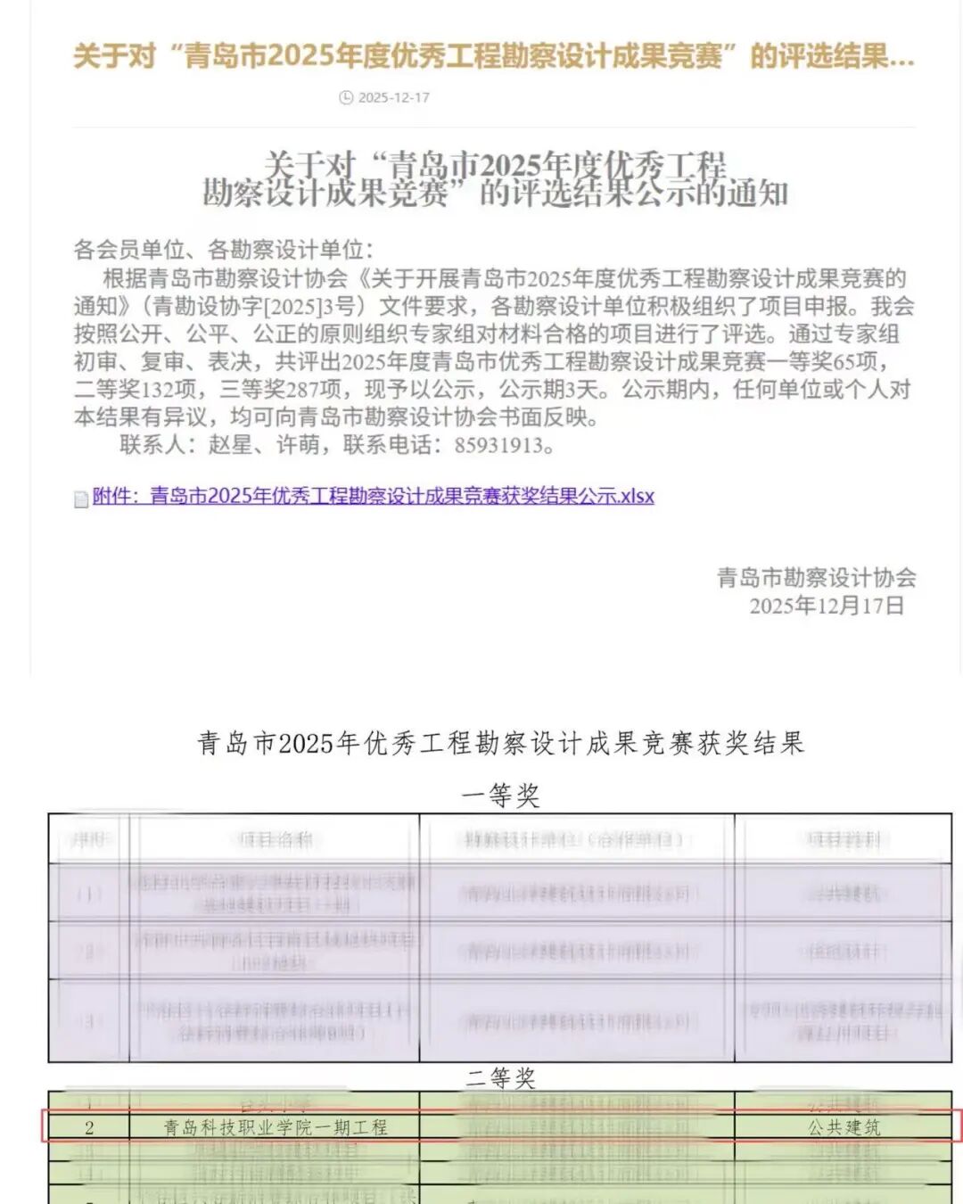 青岛科技职业学院项目被青岛市勘察设计协会评为青岛市2025年度优秀工程勘察设计成果竞赛二等奖