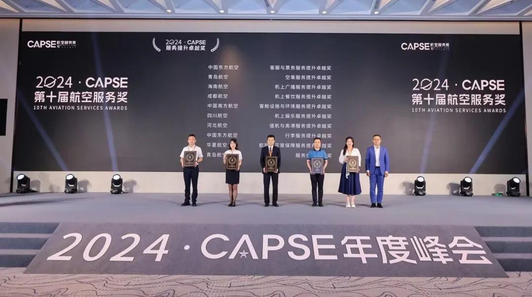在近日举办的2024CAPSE年度峰会上,青岛城投集团旗下青岛航空荣获CAPSE2023服务提升卓越奖,成为获此大奖的10家航空公司之一,同时收获CAPSE2023空乘服务提升卓越奖项。(颁奖现场)2023年,青岛航空通过打造高效协同的工作机制,在识别服务问题、分析服务现状以及提升服务水平方面由被动向主动转变,采用项目管理模式,确保问题从发现到解决的全流程得到有效跟进,服务质量管理工作取得显著成效。在2023年的CAPSE排名中,青岛航