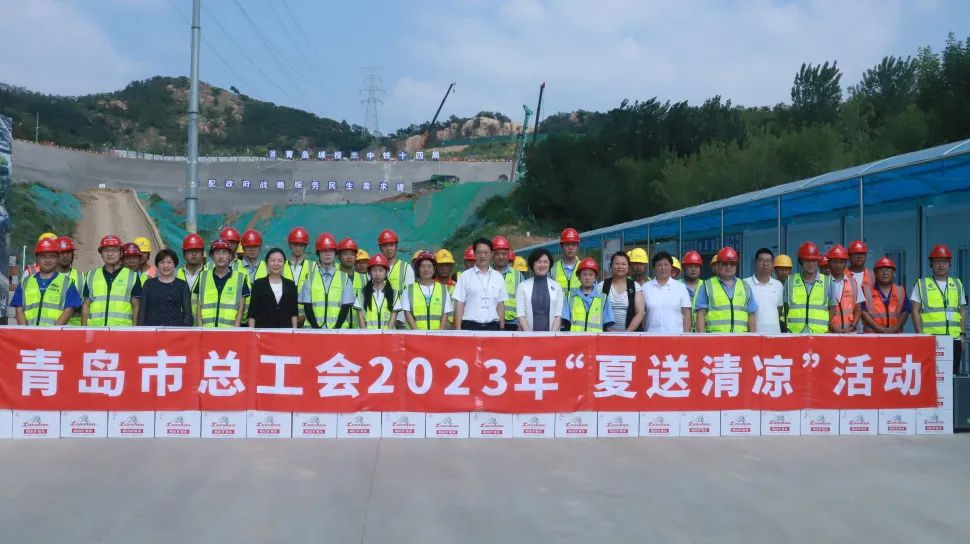 8月9日下午,青岛市总工会走进城投集团青银高速公路增设唐山路互通及连接线工程项目一线开展“情系职工 服务大局”夏送清凉活动,青岛市总工会党组成员、副主席李丽,城投集团党委委员、工会主席郭健,市总工会女职工部、城投集团党群部、交发集团相关负责人以及唐山路各参建单位、一线工人共计70余人参加。(图为活动现场合影)活动现场,李丽为炎炎酷暑中仍坚持在唐山路建设一线的建设劳动者发放了水杯、茶叶、矿泉水等防温降