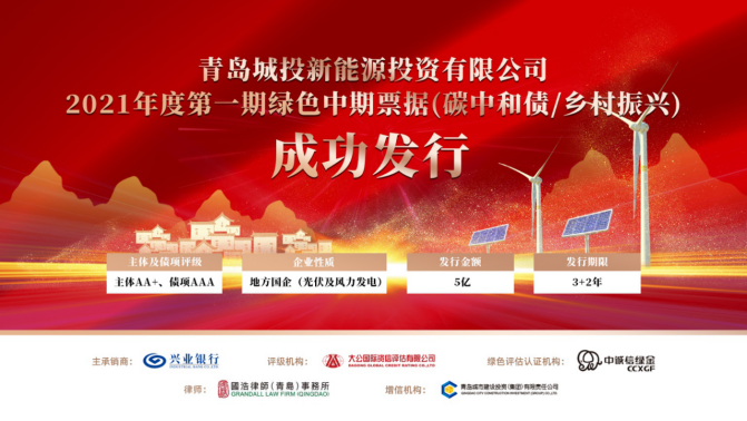 2021年10月20日青岛城投新能源公司成功发行5亿元3+2年期碳中和债,为今年AA+主体同期限绿色债券利率最低。这是青岛市首单“碳中和、乡村振兴”双贴标债券,募集资金全部用于光伏发电、风力发电清洁能源绿色项目。近期债市较低迷,市场投资积极性不高,青岛城投新能源公司作为新发行主体,首次亮相就吸引了14家投资机构,全场倍数达2.96倍,边际倍数1.2倍。